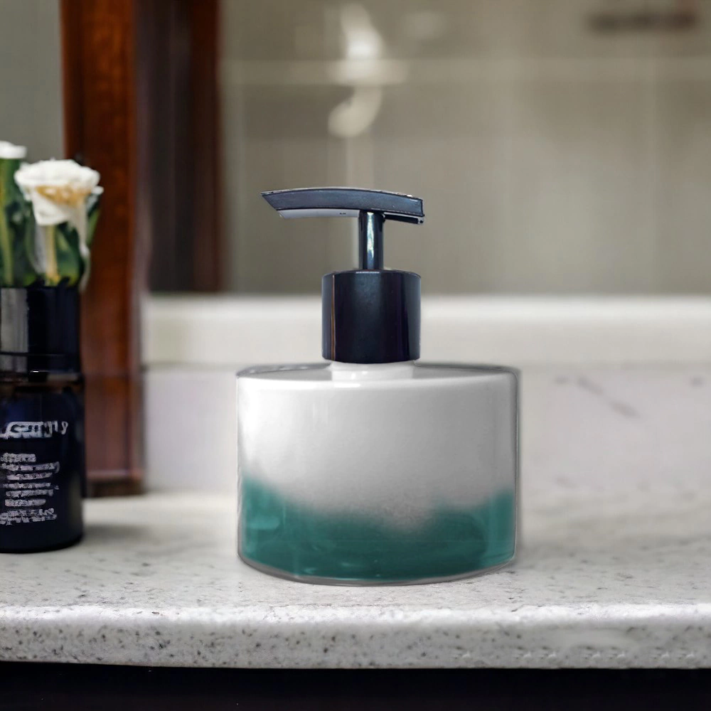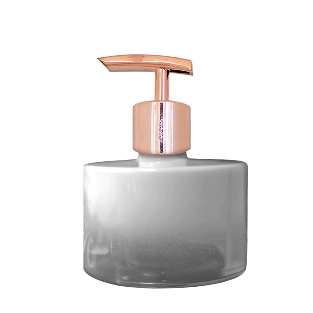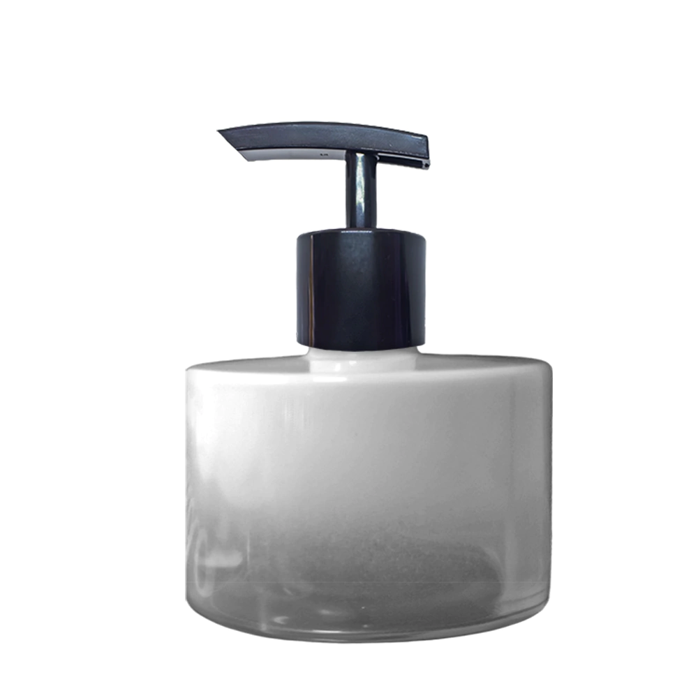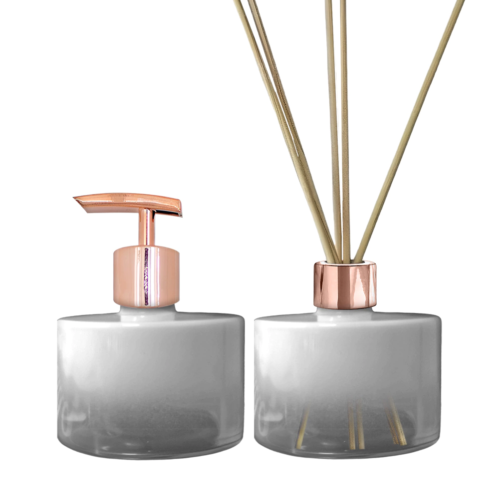 Agora, ao invés de oferecer o conjunto de Saboneteira e Aromatizador, estamos dando a opção para o cliente escolher entre a Saboneteira ou o Aromatizador com varetas, ambos utilizando o mesmo frasco de vidro com um degradê branco de 200ml.
